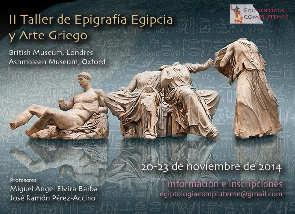 El II Taller de Epigrafía en Londres y Oxford organizado por Egiptologia Complutense, tuvo lugar del 20 al 23 de noviembre de 2014. En esta ocasión nos acompañó el Dr. Miguel Ángel Elvira Barba, uno de los máximos expertos en arte griego de nuestro país, que nos habló de las colecciones griegas (Partenón y otros) del Museo Británico y del Ashmolean Museum en Oxford, además de las consabidas explicaciones egipcias que corrieron a cargo del Dr. José Ramón Pérez-Accino, como en la ocasión anterior.